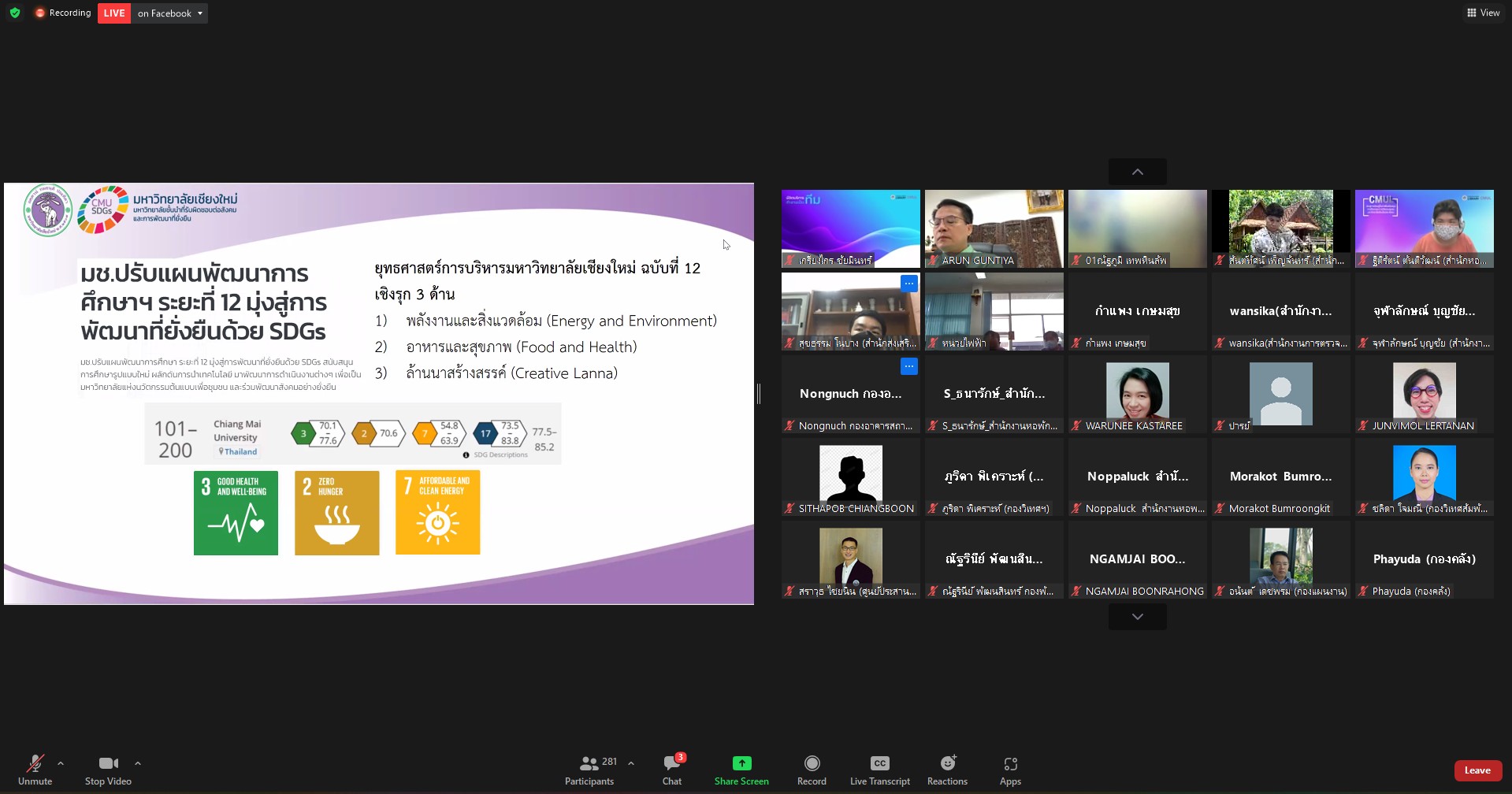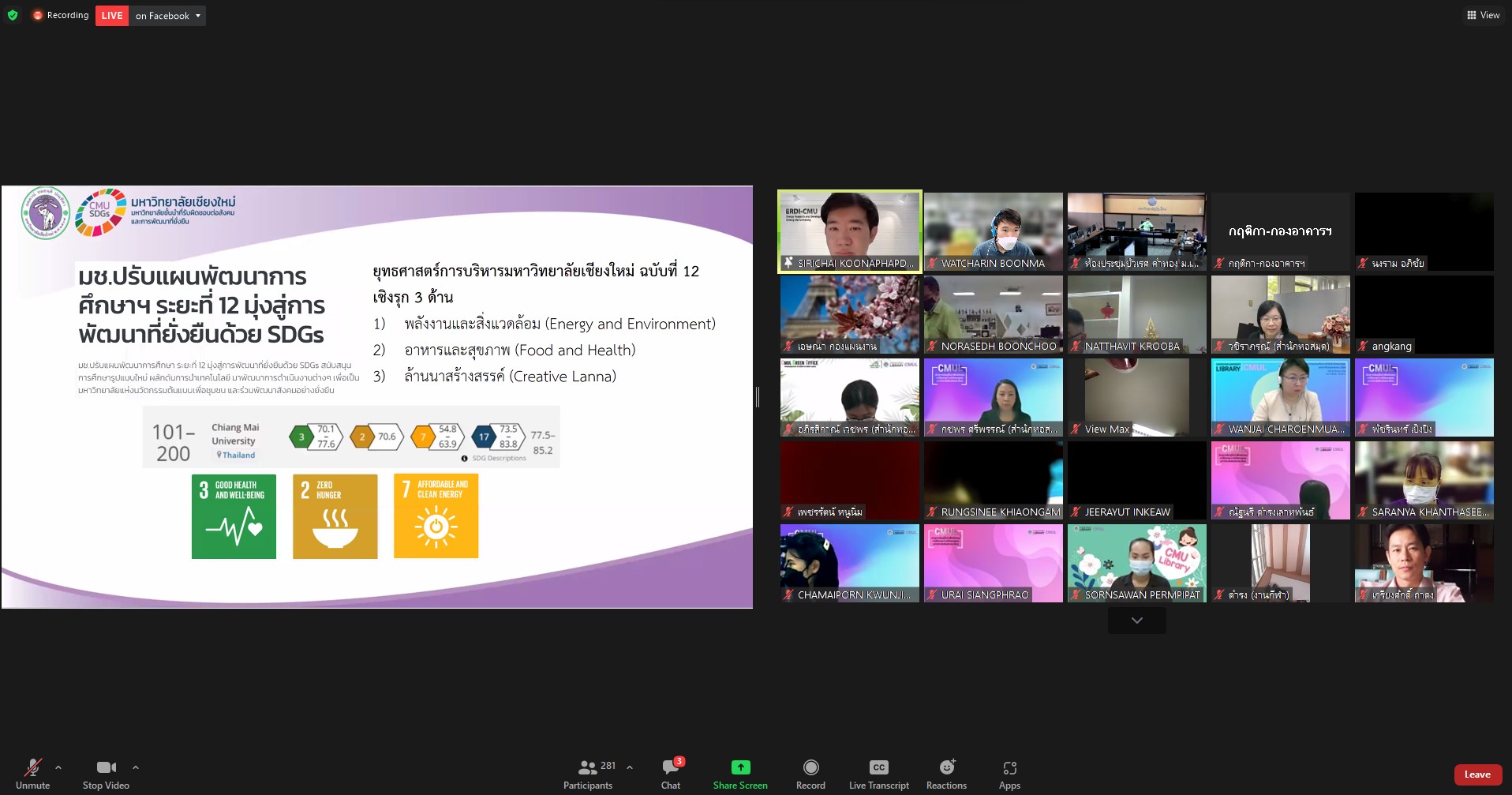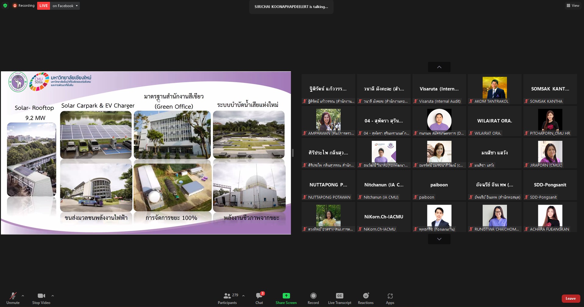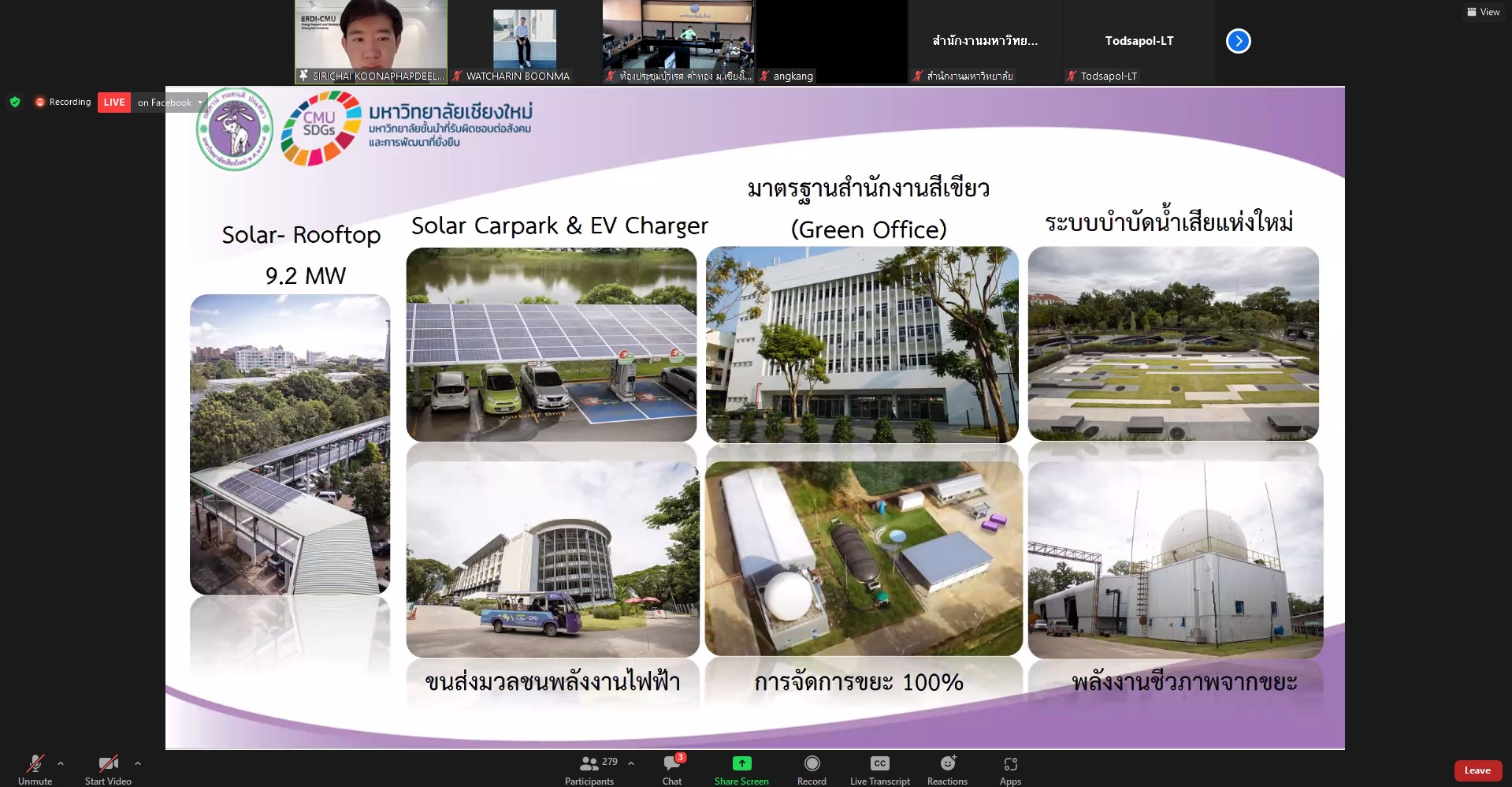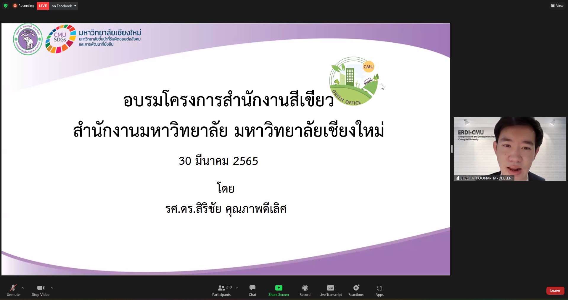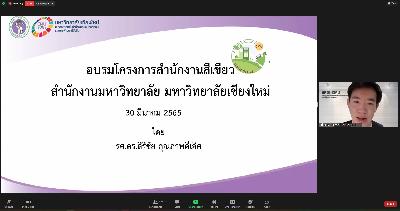 บุคลากรสำนักงานมหาวิทยาลัย เข้าร่วมโครงการอบรมการขับเคลื่อนสำนักงานสีเขียว (Green Office) ประจำปี 2565 โดยมีนายธรรมนูญ น่วมอนงค์ รองผู้อำนวยการสำนักงานบริหารงานวิจัย กล่าวเปิดงาน ซึ่งกิจกรรมประกอบด้วย การอบรมเรื่อง “ความรู้ ความเข้าใจเกี่ยวกับโครงการสำนักงานสีเขียว” โดยมี ผู้ช่วยศาสตราจารย์ ดร.สิริชัย คุณภาพดีเลิศ รองผู้อำนวยการสถาบันวิจัยและพัฒนาพลังงานนครพิงค์ มหาวิทยาลัยเชียงใหม่ เป็นวิทยากร และการอบรมเรื่อง “ก๊าซเรือนกระจก (Greenhouse Gas)” โดย อาจารย์ ดร.สรัลนุช ภู่พิสิฐ ภาควิชาวิศวกรรมสิ่งแวดล้อม คณะวิศวกรรมศาสตร์ มหาวิทยาลัยเชียงใหม่ เป็นวิทยากร เพื่อสร้างความรู้ ความเข้าใจ และตระหนักรู้เกี่ยวกับการบริหารจัดการทรัพยากร และการใช้พลังงาน ผ่านโปรแกรมออนไลน์ Zoom เมื่อวันที่ 30 มีนาคม พ.ศ. 2565